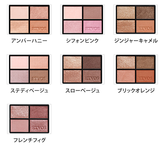 スキンケアしながらメイクアップをお楽しみいただける4色入りアイシャドーパレットです。着目したのは“大人のくすみ(*1)やすい、まぶた”。8種の美容成分(*2)配合で目元に潤いを与えながら、上品なつやと発色で彩ります。(*1)乾燥によるもの(*2)肌に潤いを与える成分:ヒアルロン酸Na、ポリクオタニウム-61、シロキクラゲ多糖体、アシタバ葉/茎エキス、クダモノトケイソウ果実エキス、モモ花エキス。肌を整える成分:グリチルレチン酸ステアリル、グリチルリチン酸2K<パレット/全7種>アンバーハニー:まろやかな琥珀とはちみつのぬくもりが溶け合う、ウォームベージュパレット。繊細なパールとマットの質感が溶け合う4色のウォームトーンが、自然な陰影(*3)と奥行(*3)を演出します。ナチュラルな仕上がりの中にほんのり魅惑的な印象を。シフォンピンク:軽やかなシフォンのような透け感と、甘さをひそませたピンクベージュパレット。さりげないパールと色の重なりが、ふんわりとした血色(*3)と肌なじみを引き立てます。甘さを控えめに、上品で凛とした印象に。ジンジャーキャメル:繊細な光のリフレクションをまとわせるような(*3)シャイニーベージュパレット。ステディベージュ:スタイリッシュな抜け感(*3)を演出し,肌に溶け込むような発色で、ナチュラルな立体感(*3)のある印象的なまなざしに。モダンベーシックなピンクブラウンのパレット。スローベージュ:表情にやさしさと品を宿すような(*3)ベージュブラウンパレット。ブリックオレンジ:あたたかみを感じさせる(*3)オレンジブラウンパレット。フレンチフィグ:どこか儚げな印象とさりげなく凛とした表情(*3)をあわせもつピンクモーブパレット。(*3)メイクアップ効果によるもの