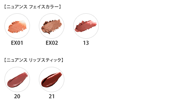多彩に使えるクリームカラー『ニュアンス フェイスカラー』現品と、しっとりとつややかな質感で唇を乾燥から守る『ニュアンス リップスティック』現品、洗顔後すぐのプレ美容液『エンリッチバイオセラム』のミニボトルをセットにしました。『ニュアンス フェイスカラー』は、ベタつきにくいさらさら感と、唇や目元を乾燥から守るしっとり感のバランスにこだわり、チークやアイに使ってもよれにくく、リップに使っても快適なテクスチャーを追求。透け感のある発色で肌になじみやすく、感情がにじみ出るような、じんわりとした存在感(*)を放つとともに、メイクしている間、肌荒れを防ぎながら肌の潤いを守ります。『ニュアンス リップスティック』は、ラフに直塗りしても美しく仕上がり、肌から浮かない発色で表情にアクセントをプラス。『エンリッチバイオセラム』は、優雅なゼラニウムとダマスクローズの香りで、すこやかな肌を保ちます。(*)メイクアップ効果によるもの※こちらの商品はHANKYU BEAUTY ONLINEのみの販売となります。<キット内容>・ニュアンス フェイスカラー(メイクアップ チーク その他/現品/5.5g/全3色より1色選択)・ニュアンス リップスティック(リップ/現品/2g/全2色より1色選択)・エンリッチバイオセラム(美容液/ミニボトル/10ml)【ニュアンス フェイスカラー】下記の3色より1色を選択EX01 Friends(フレンズ):友達と過ごす飾らない時間のようなきらめき。ジョイフルなラメが輝くシアーなオレンジです。ポジティブな血色感と、肌に溶け込むようななめらかさを併せ持ちます。アイ、チーク、リップに。 ※販売終了EX02 Hanashikotoba(話し言葉):水面に光が反射するような、濡れたようなつやとまたたきを帯びたベージュ。ベーシックな印象の中にユニークさが垣間見えるカジュアルなカラーです。アイ、チーク、リップのほか、ファンデーションの下に仕込むコントゥアにも。 ※販売終了13 Yumenoato(夢のあと):普遍的な知性を感じる大人のディープレッド。程よい青みとブラウンニュアンスが含まれている、肌なじみに優れたカラーです。 アイ、チーク、リップに。【ニュアンス リップスティック】下記の2色より1色を選択20 Tayori(便り):くすみモーヴのニュアンスを含んだクリーミーなビンクベージュ。さりげなく表情をスタイリッシュに。21 Touge(峠):ブラウンやチェリーのニュアンスを含んだモダンなレッド。シンプルからドラマティックまで幅広いスタイルに似合います。