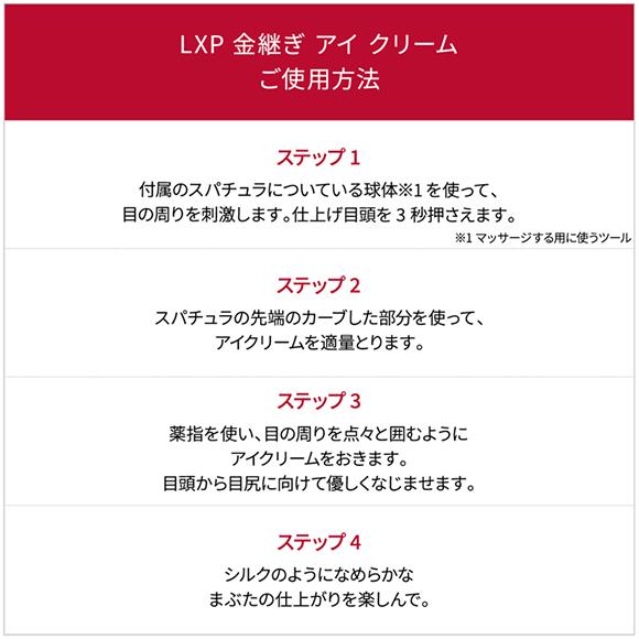 「SK-II」のエイジングケア(*2)シリーズをご体感いただけるコフレです。時を重んじる陶磁器の修復技法“金継ぎ”をイメージヒントにしたラインを通じて、ハリとつやをたたえた、キメ細やかな肌を目指します。アイクリームの現品15gサイズをメーンに、美容クリームのサンプルサイズをお付けいたしました。(*1)ハリ・つやを与えるとともに、肌のキメを整えること(*2)年齢に応じた、肌のキメを整えてハリ・つやを与えるお手入れのこと<キット内容>・LXP 金継ぎ アイ クリーム(目元ケアクリーム/現品/15g)・LXP 金継ぎ クリーム(美容クリーム/サンプル/8g)