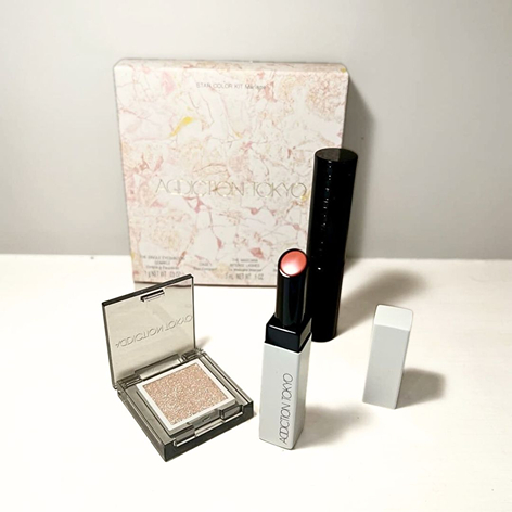 シャンパンベージュのアイシャドーと、コーラルベージュのリップバーム、漆黒のマスカラをセット