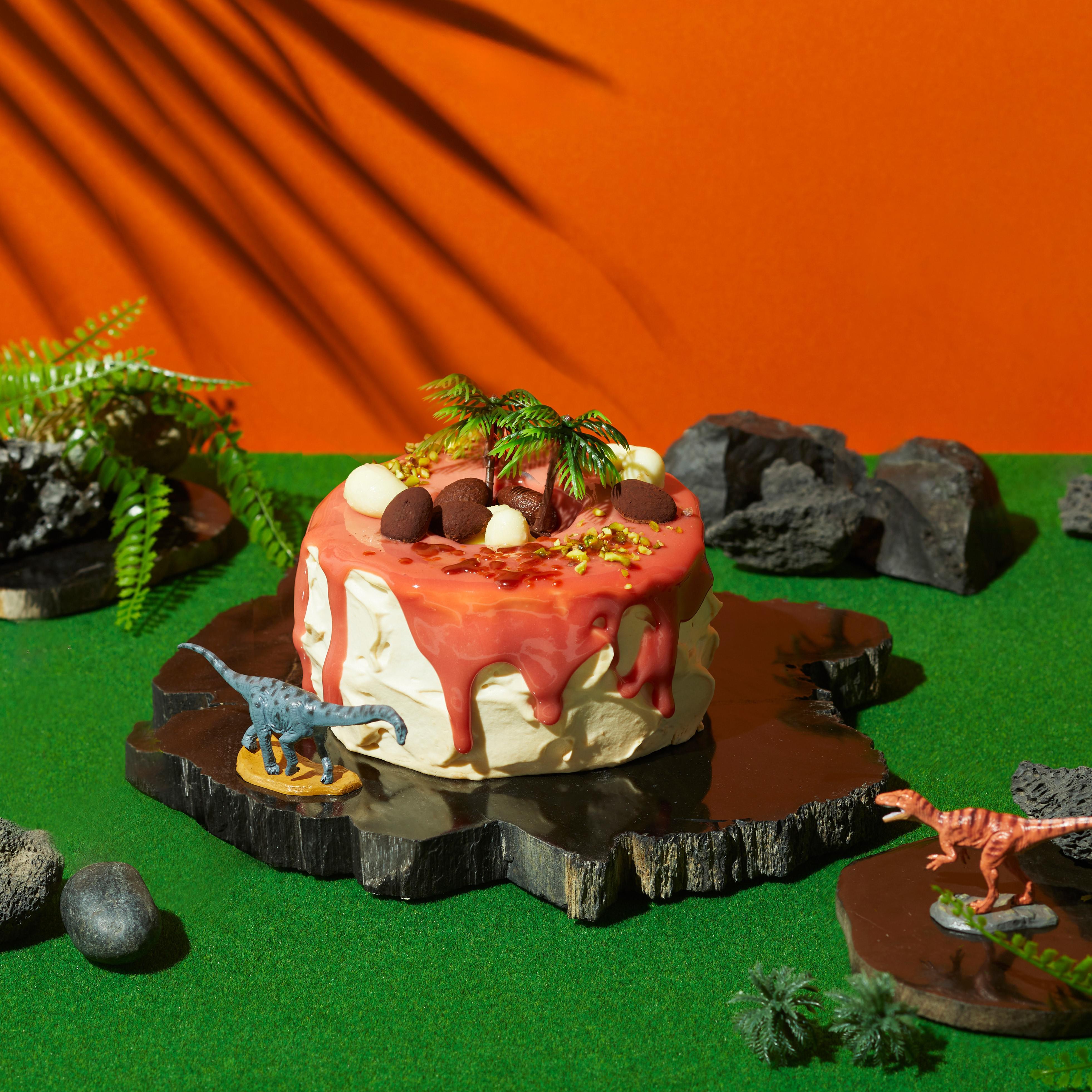 福井県立恐竜博物館監修の恐竜フィギュアが2匹ついてくる、飾って楽しめるオリジナル恐竜ケーキです♩
