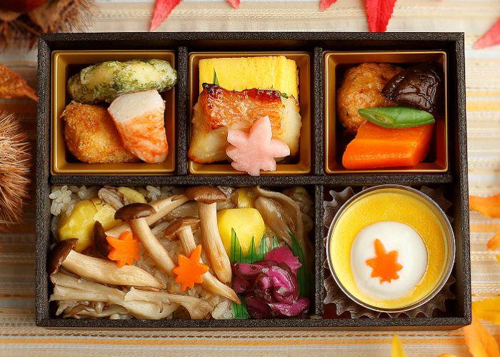 「南瓜スープ寄せ」「栗ときのこの紅葉御飯」「スモークサーモンクリームコロッケ」に出汁たっぷり含んだ煮物などを詰め込んだお弁当。