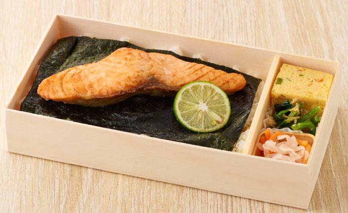 昭和の仕出しや料亭弁当でよく使われてきた焼き魚である「鮭の幽庵焼き」をメインとした、当店でも人気な【NORIの海苔弁】シリーズの鮭海苔弁当です。白ご飯におかかと海苔を重ね、鮭の幽庵焼きをのせた素朴なお弁当。副菜を少し添えて、ほっとするような"昭和の海苔弁"の雰囲気をそのままに。