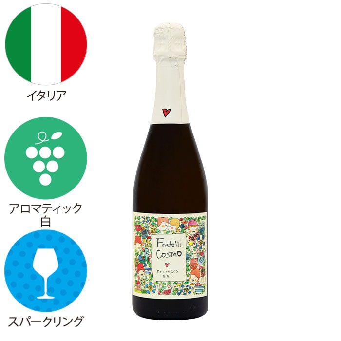 フルーティーな味わいながら骨格を感じる、エレガントなスプマンテ。愛らしいラベルには、「愛する人と美味しいワインをシェアする喜び」をこのワインを通じて感じて欲しい、というオーナーのコスモ兄弟の願いがこめられています。