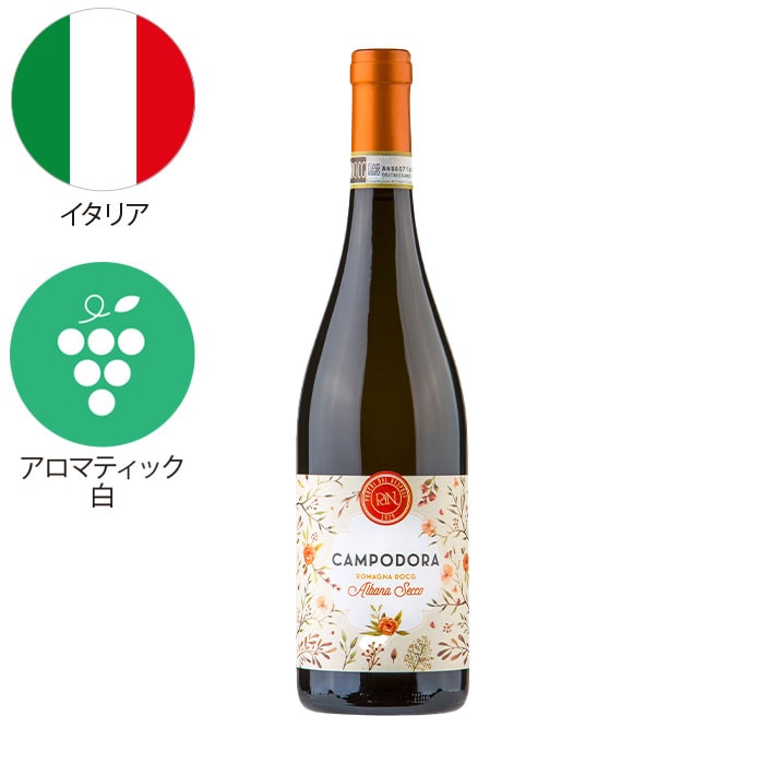 ロマーニャ伝統のブドウ、アルバーナから生まれる「カンポドーラ」。黄桃やアプリコット、ジャスミンの香りと、まろやかさを酸が引き締めるバランスの良い味わいが特長です。