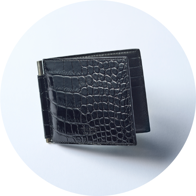 建築的なデザインで使いやすく、エレガントな雰囲気のある、クロコプリントのシャイニーなレザー素材を採用。