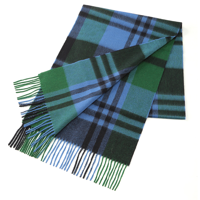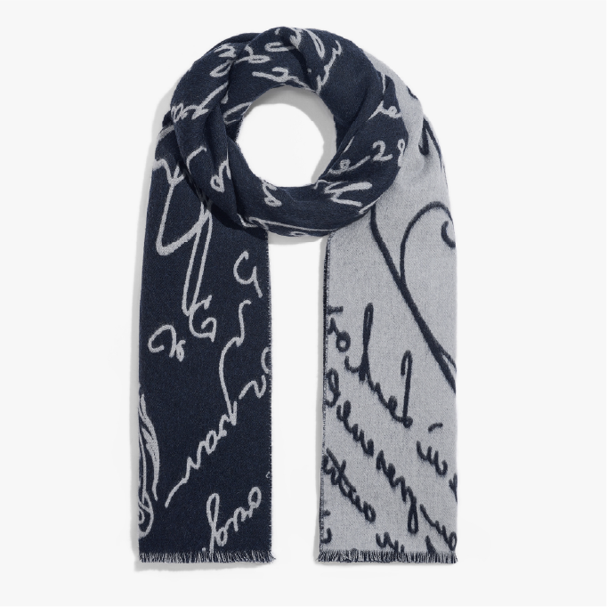 ブランドを代表するカリグラフィー柄を両面に配したウールのスカーフ。バイカラーなのでアレンジも自在。