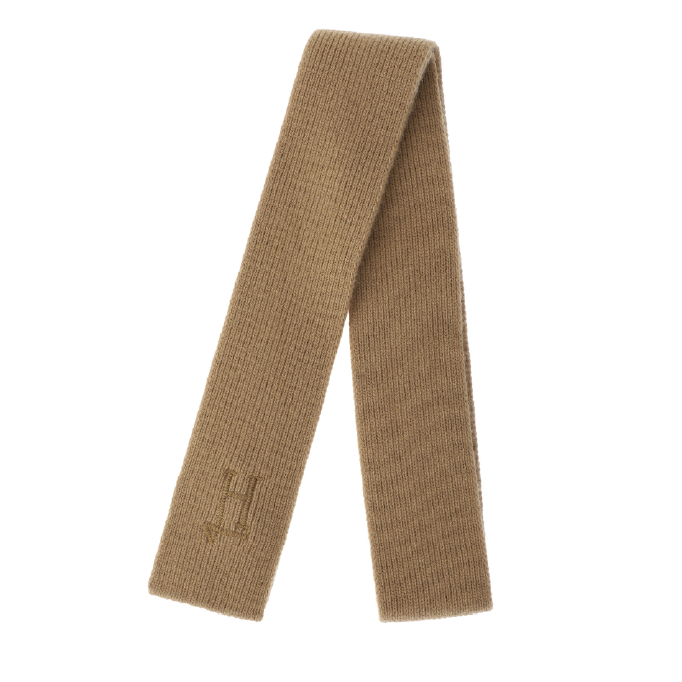 Hロゴ刺繍付きのウール細マフラーは、その細さゆえに様々なアレンジができ、コーディネートにこなれ感をもたらす新アイテム。6色展開も魅力。