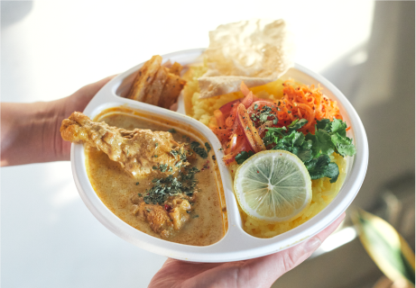 徳島の地鶏“阿波尾鶏”と様ざまなスパイス、生クリームとレモンの酸味が、一体となった旨味タイプのスパイスカレー。副菜は玉ねぎのアチャール(ピクルスのようなもの)、大根のサブジ(漬物のようなもの)、にんじんのスパイスラぺ。仕上げに岡山パクチーをトッピング。