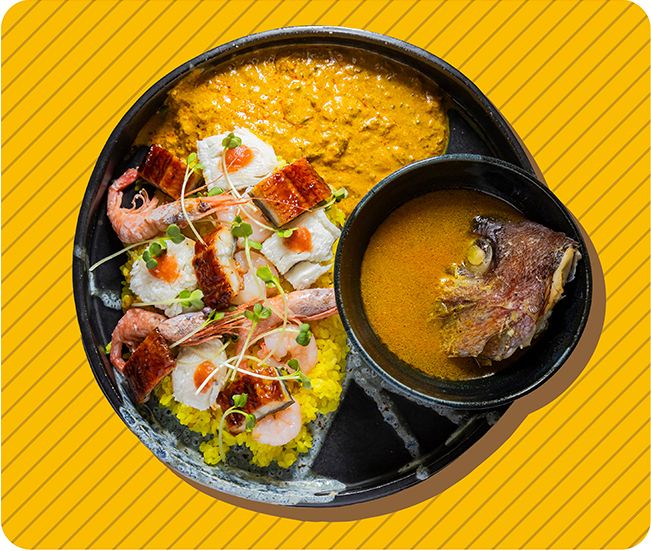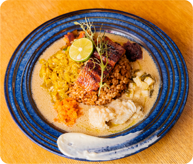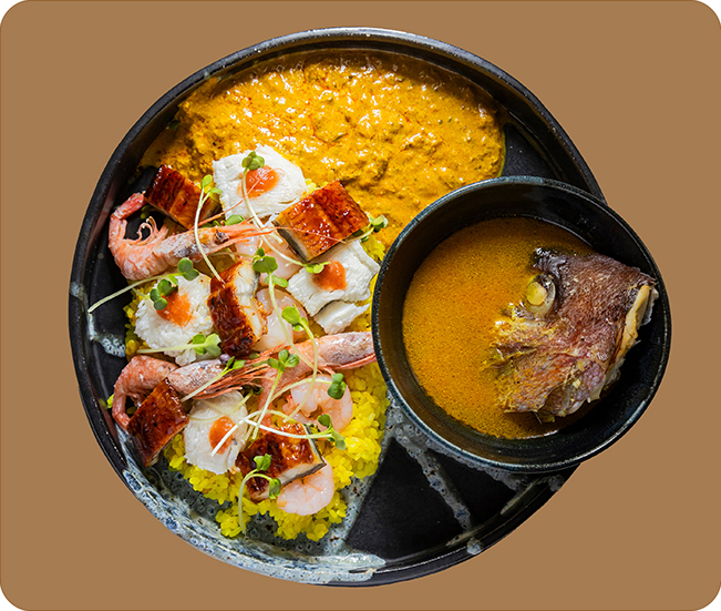 明石産天然鯛のかぶとから取った白湯を酸っぱ辛く仕上げ、本マグロを贅沢に加えたクリーミーでコクのあるカレーを合わせました。鰻と鱧、2種類の海老をのせたターメリックライスのちらし寿司との相性も良く、和風の優しい味わいをベースにしたおいしさがたまりません。