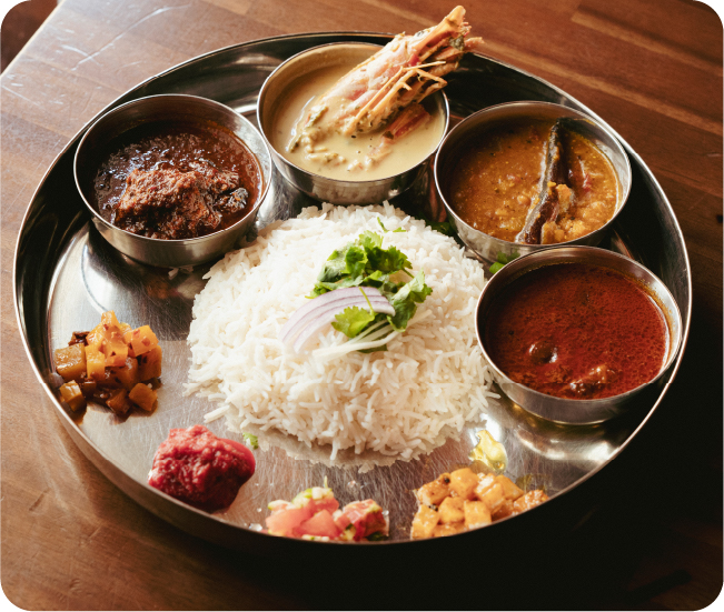 インド料理を中心としたメニューで愛される2店舗による、初のコラボプレートが完成!夏野菜を使ったマトン挽き肉のカレーと、夏らしい酸味とココナッツが香るインド・ケララ州のフィッシュカレーをメインに、季節の野菜を使った副菜をたっぷり添えました。夏にぴったりの、爽やかな味わいを楽しんで。