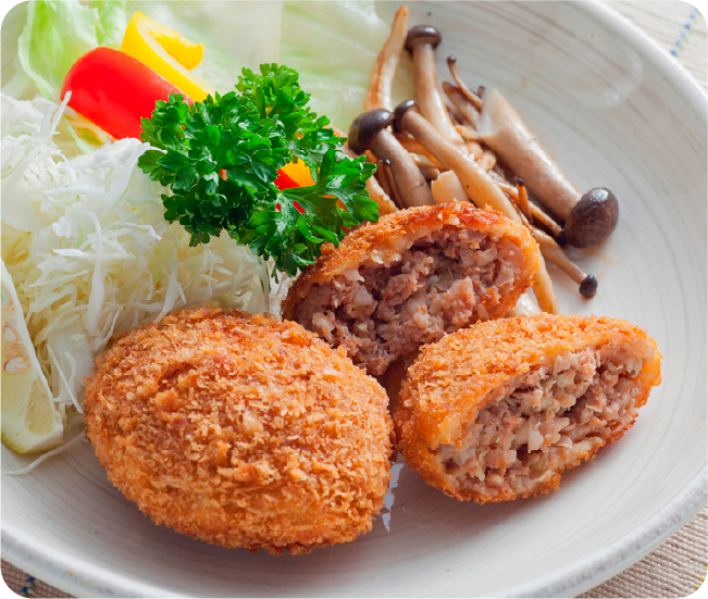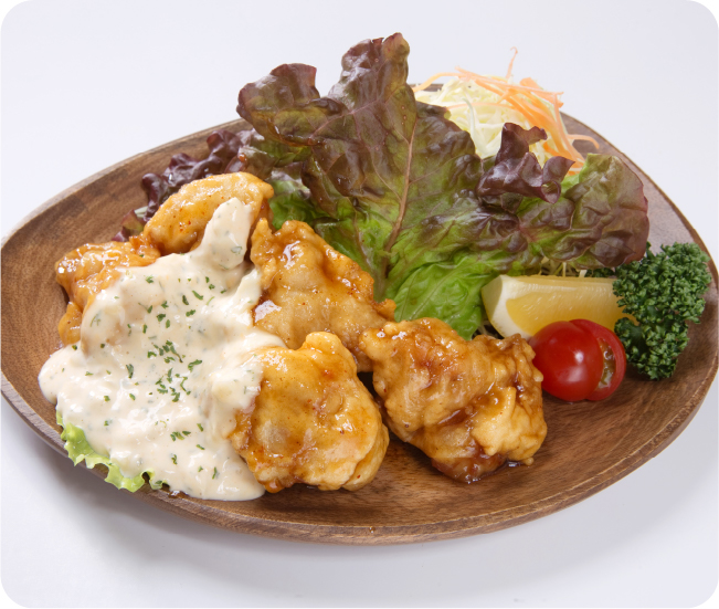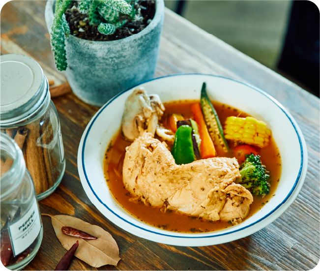 綾町産の香味野菜とみやざき地頭鶏(じとっこ)のガラ、15種類のスパイスをじっくり煮込むことで、野菜と鶏の出汁が効いた風味豊かなグルテンフリーのスープカレーに仕上げています。トッピングには、スパイスと一緒にホロホロになるまで煮込んだ日南どりの骨付きもも肉を丸ごと1本!スプーンでお肉をほぐし、オリジナルブレンドのスパイスソルトで味変しながらお楽しみください♪