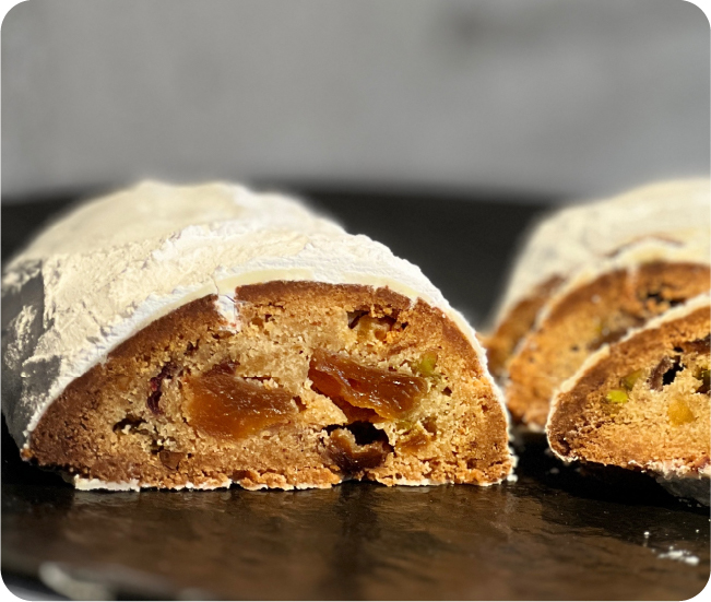 “地域の縁側”をコンセプトにパンのほか、カフェを併設する「ヴァンダラスト」。オーナーの大村 田シェフは2012年ドイツで開催されたパンのワールドカップ『ibacup』で4位入賞、2023年には日本代表の監督を務めています。ローストしたクルミとアーモンド、2種の洋酒に漬けたサルタナ、オレンジ、フィグを練り込んだシュトーレンは、しっとり感と香りを大切に焼き上げます。シナモンなどをオリジナルブレンドしたスパイス、バニラや柑橘の香り、様ざまなフレーバーの重なりをお楽しみください。