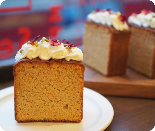 “Back to New Basic”をコンセプトに、定番のアイテムに現代的なエッセンスをプラスしたパンとお菓子を作っています。伊予柑、マンダリンオレンジ、マスカットレーズンを、オレンジリキュールとカモミールのコーディアル抽出エキスでじっくりと漬け込み、華やかな香りに仕立てました。生地には自家製のマルコナ種アーモンドペーストと、香ばしいほうじ茶を練り込み、奥行きのある味わいで包み込んでいます。